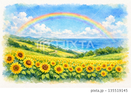 ひまわり畑 丘陵地 虹 海 夏 水彩画