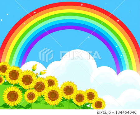 ひまわり畑にかかる虹と夏空の背景イラスト