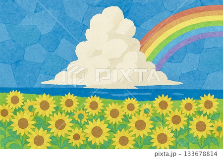 ひまわり畑 青空 入道雲 海 虹 貼り絵風