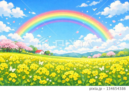 虹と菜の花畑 ほのぼのとした春のイラスト AI生成