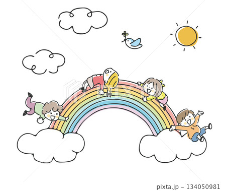 虹の上で手をつなぐ子どもたちのイラスト(かわいい笑顔・保育・教育・友情)
