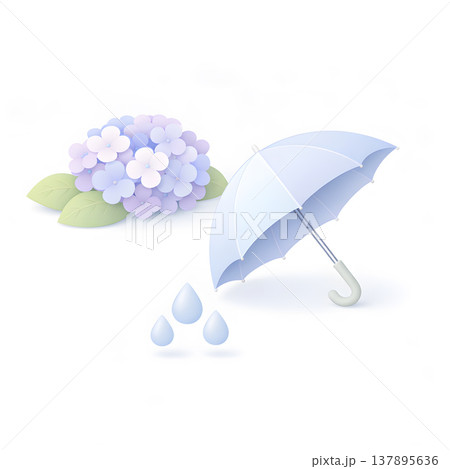 紫陽花と傘と雨粒の3Dミニマルアイコン(白背景・梅雨)
