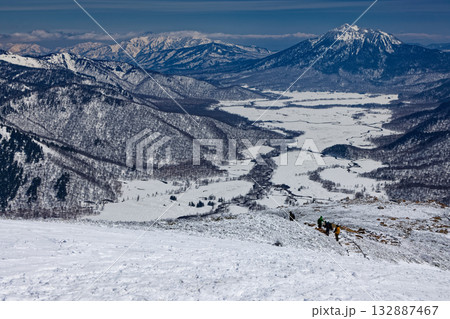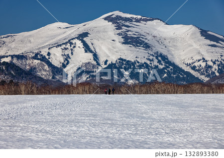 残雪期の尾瀬ヶ原を行く登山者と燧ヶ岳