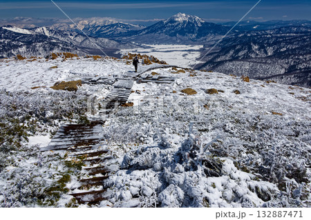 残雪期の至仏山山頂のスノーボーダーとアヤメ平・日光白根山の眺め