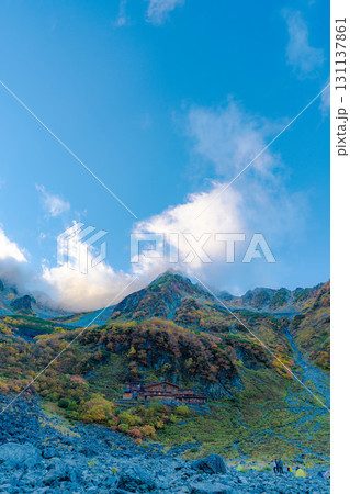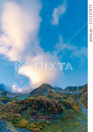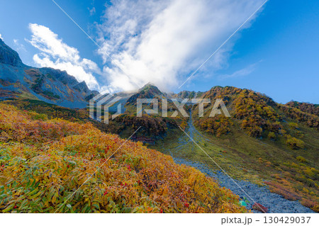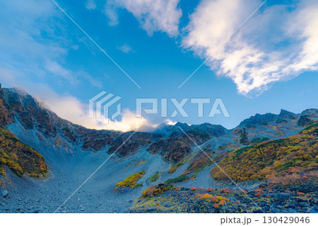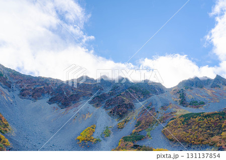 【紅葉素材】秋の紅葉が見ごろになった雲がわく涸沢カールの風景【長野県】