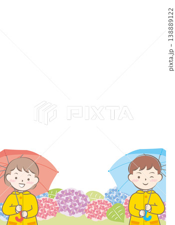 傘をさすレインコートの子供たちと紫陽花のフレーム