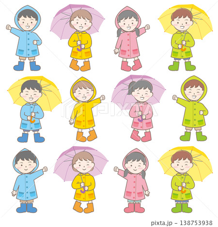 雨の日の合羽姿の子供たち 梅雨 傘