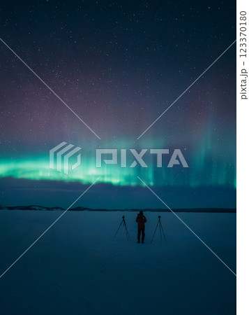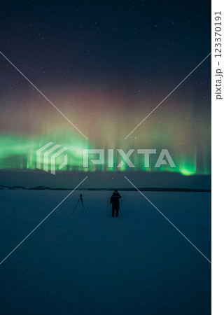 オーロラ鑑賞の写真を撮る人