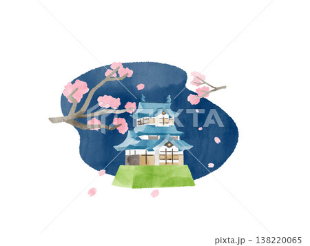 夜桜と城 舞う花びら 水彩 イラスト かわいい デフォルメ 春 ライトアップ 観光 素材