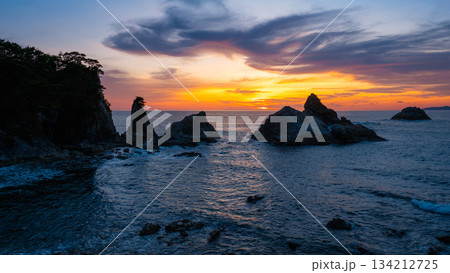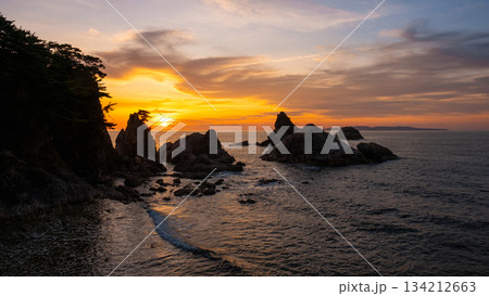 角田岬の夕暮れ:佐渡島に沈む夕日