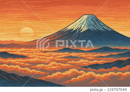 富士山とオレンジ色の日の出と紅色に染まる雲のイラスト