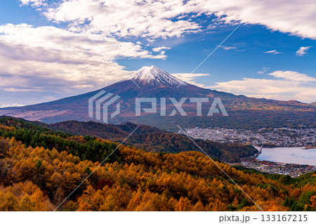 【山梨県】カラマツの黄葉と雪化粧した富士山
