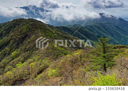 丹沢・塔ノ岳から見る新緑の表尾根と雲湧く大山