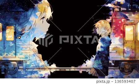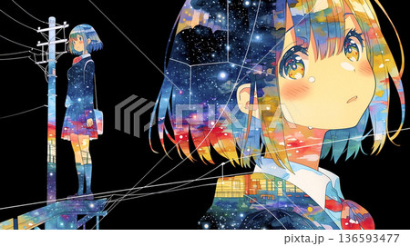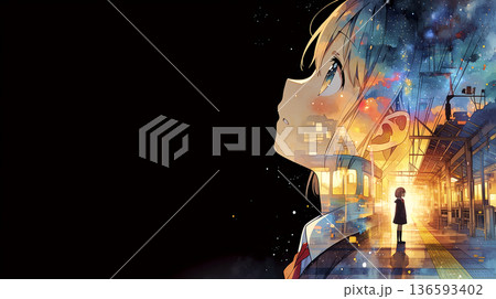 夕焼けの海辺で微笑む女性 桜の髪飾りのアニメイラスト