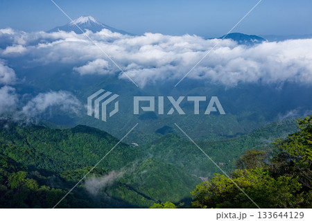 新緑の丹沢・檜洞丸稜線から見る雲上の富士山