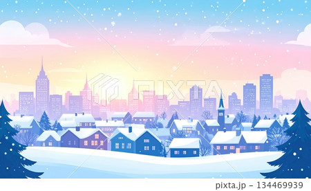 冬の夜空と街並みの星空フレーム背景・水彩タッチ・青系イラスト