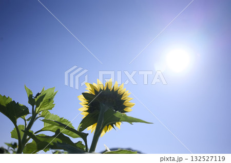 青空の下の大きな藤の木と藤の花から見えるキラキラの太陽
