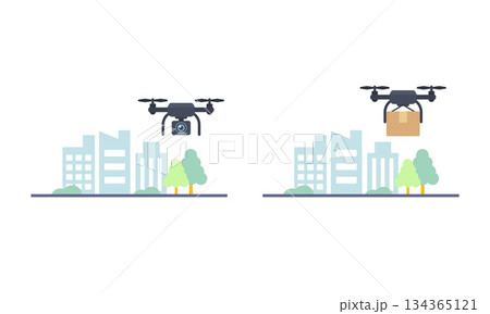 都市景観と空撮ドローンと配送ドローン