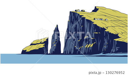 traditional north village on the rock coast summer openspace landscape. Cartoon vector illustration. Ecotourism and holiday travel.