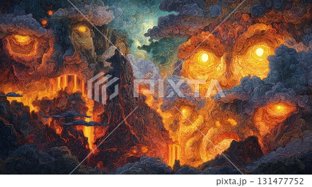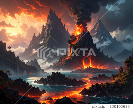 不安を感じる暗雲の闇に浮かぶ険しい岩山に溶岩が流れ出す禍々しい恐怖を感じる風景