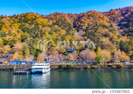 栃木県 日光市 秋の中禅寺湖(遊覧船から見た湖畔の紅葉 日光山 中禅寺)