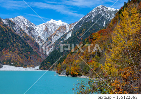 長野県大町市平 鮮やかなミルキーブルーの高瀬ダム調整湖の紅葉と青空に映える冠雪した山の景色