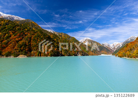 長野県大町市平 鮮やかなミルキーブルーの高瀬ダム調整湖の紅葉と青空に映える冠雪した山々の景色