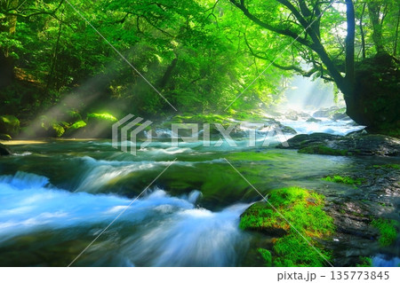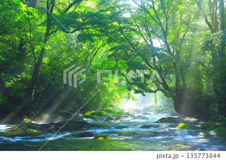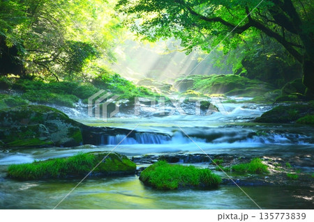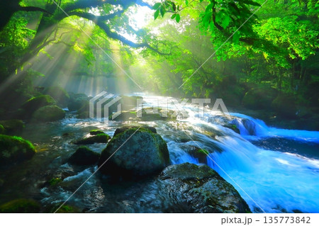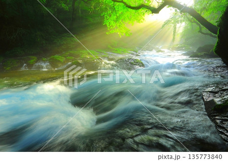 美しい光芒の出る菊池渓谷(熊本県菊池市)