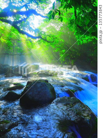 美しい光芒の出る菊池渓谷(熊本県菊池市・縦構図)