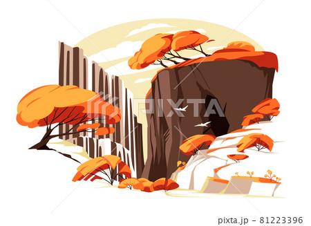 Waterfall in autum rock. vector illustration. Flat colorful panoramic landscape with river water falling from mountain rocks, fall yellow, a cave, birds in flight, wild trees and bushes on the back