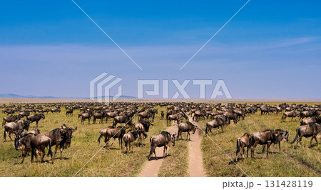 ヌーの大群がサバンナを横切る壮大な光景(マサイマラ)
