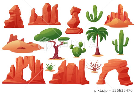 Desert stones and plants mega set elements in flat graphic design. Collection objects of different trees, cactus, palms and rock mountains for wildlife African landscape scenes. Vector illustration.