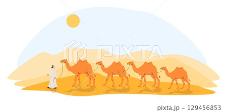 Caravan of camels on background of beautiful sandy landscape. Saudi man leading dromedary. Sand dunes panorama. Bedouin journey. Nature wild desert. Sahara barchans scene. Vector concept