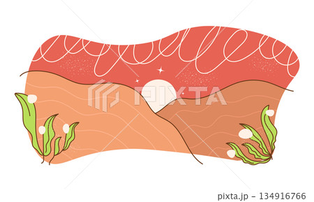 Hand Drawn Minimalist Desert Landscape Illustration with Sun in the Middle of Sand Dunes