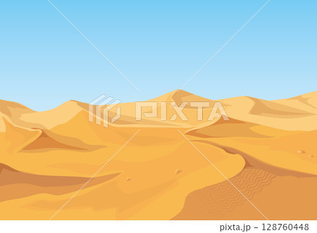 Flat graphic vector illustration of abstract desolate desert landscape with sandy dunes under clear blue sky. Simple decorative cartoon concept of nature scenery.