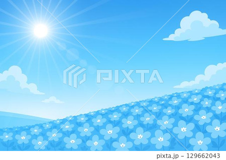 青空の下に広がる菜の花畑の爽やかな春の風景イラスト