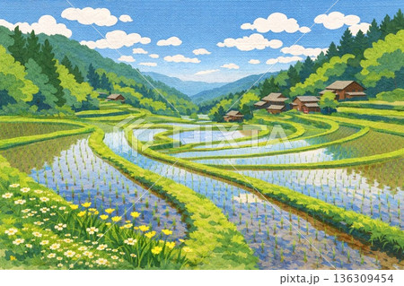 春の田園風景 田んぼ 棚田 山間部 稲作 貼り絵風