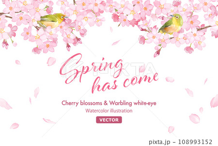 春の花:さくらとメジロの水彩イラスト。フレーム装飾。(ベクター。レイアウト変更可能)