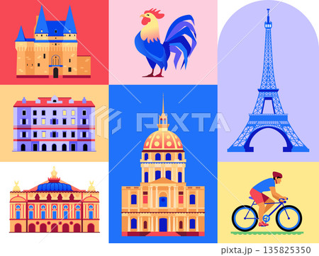 French landmarks and symbols - set of flat design style objects