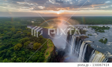 虹と水煙が織りなすビクトリアの滝の壮大な朝景
