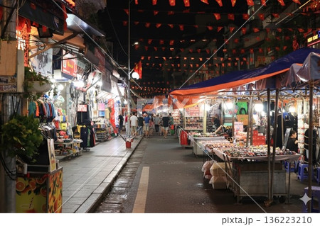 Vector of Vibrant Chinese street with traditional houses, lanterns and tourists.