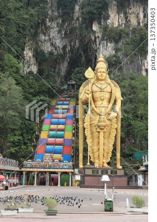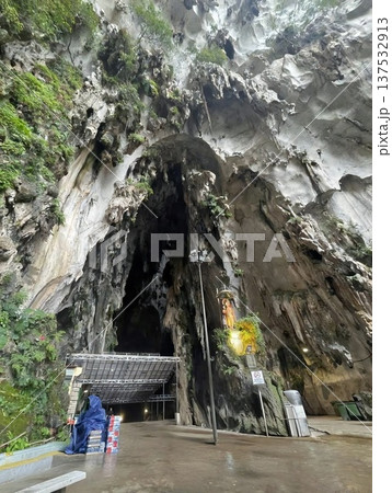 A large golden statue of a figure is located at the entrance of a dark cave. People walk around the area, enjoying the view. Green trees surround the cave, and it is daytime.