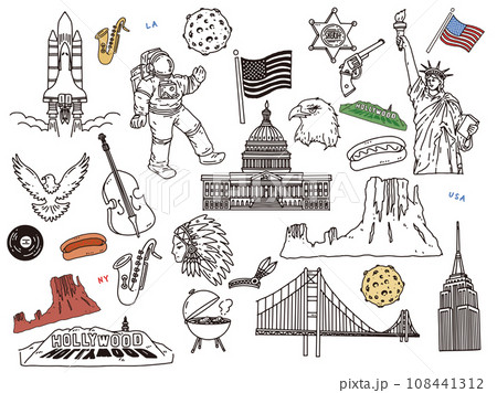 線画のイラスト(手書き、アメリカ、宇宙飛行士、LA、ニューヨーク、ハンバーガー)
