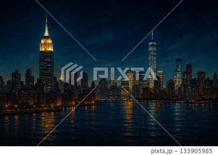 夜のニューヨーク摩天楼が水面に輝く幻想的なマンハッタン夜景