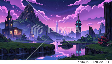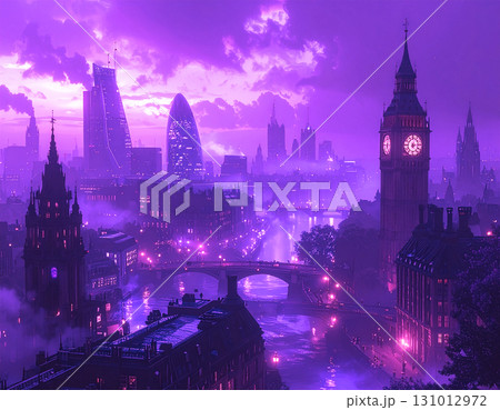 紫の月夜に浮かぶレトロな街並みが霧に包まれ幻想的な風景