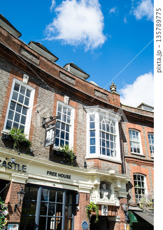 明るい日差しの下の歴史的な赤レンガの建物 ロンドン郊外のウィンザーの街並み