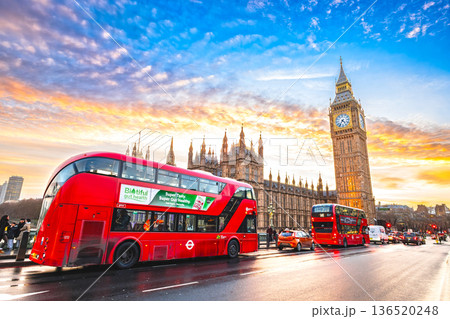 ロンドン 夕映えのウェストミンスター宮殿とダブルデッカー