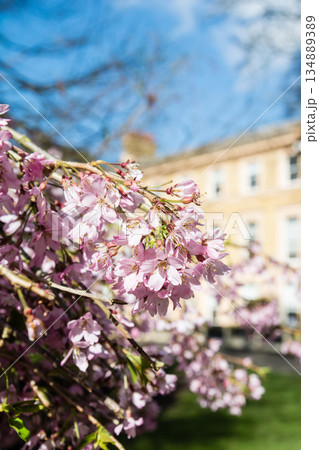 明るい日差しの下の桜に似た薄紫の小さい花と遠くに見えるレンガ造りの建物 キューガーデンにて