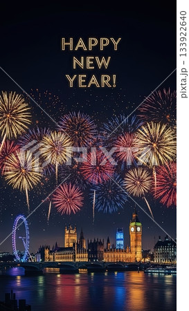 ロンドン夜景と華やかな花火が彩る新年のHappy New Year! スマホ用グリーティングカード