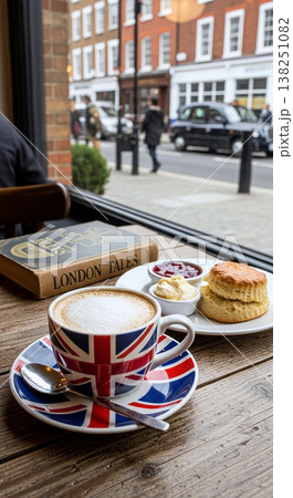ロンドンの街並みを望むカフェで楽しむ、英国国旗柄のカップのカフェラテとスコーン